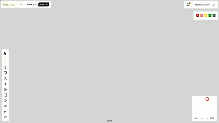 CortLex visualisiert rechtliche Zusammenhänge auf einem interaktiven Whiteboard. Paragrafen, Dokumente, Notizen und Argumentationsketten werden auf Basis der konkreten Anforderung grafisch miteinander verknüpft